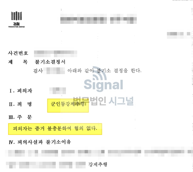 의뢰인은 직업군인으로 같은 부대원으로부터 군인강제추행으로 고소를 당하여 수사를 받게 되었습니다. 직업군인 등 공무원은 성범죄로 벌금 100만 원 이상의 형을 선고받으면 당연퇴직이 되므로 의뢰인은 형사처벌 뿐만 아니라 공무원 신분을 잃을 위험이 있었습니다.