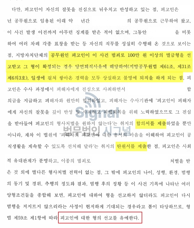 그 외에 추가적으로 다양한 양형자료를 제출한 결과, 피고인은 선고유예 판결을 받아 공무원 신분을 유지할 수 있었습니다. 성범죄 사건은 처벌 수위가 높을 뿐만 아니라 공무원인 경우에는 신분 유지와도 직결되므로 사건 초기부터 변호인과 일관성 있고, 체계적인 대응을 하시기를 권해드립니다.